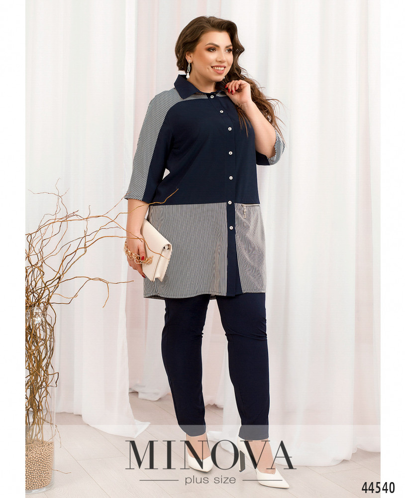 Стильный костюм-двойка батал, рубашка с контрастными вставками и отложным воротничком, застёгивается на ряд пуговиц спереди на планке. Слева - прорезной карман в рамку, под молнией. По бокам подола - разрезы. Рукава без манжет. Брюки с высокой талией, в пояс вшита резинка, по бокам - карманы в шве. Застёжек нет.