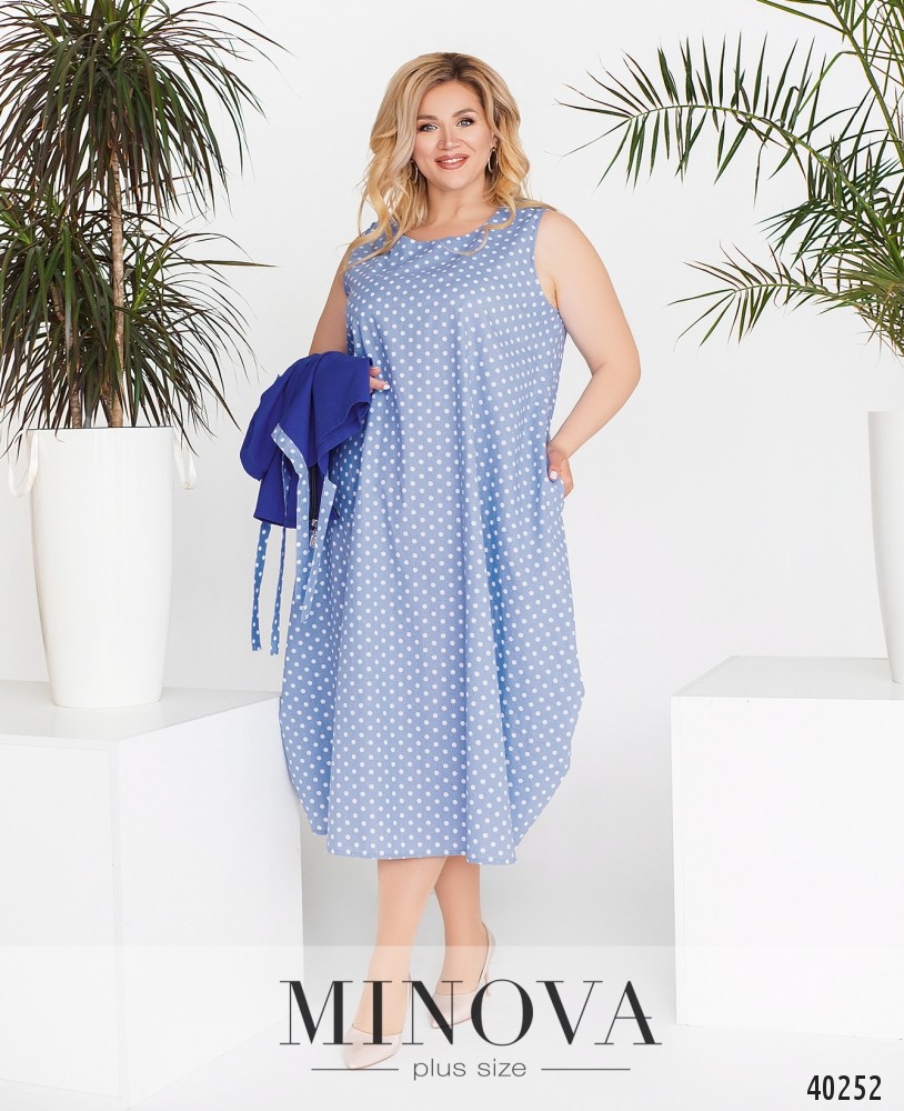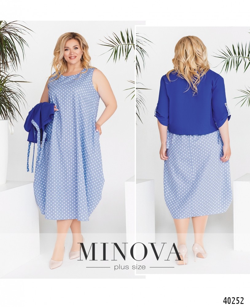 Оригинальный костюм большого размера, в комплекте - платье и накидка с молнией. Платье без рукавов, без застёжек и карманов, по бокам присобрано. Кофточка с регулируемыми рукавами, по бокам - разрез и подшиты ленты, которые можно завязать бантом. Без карманов.