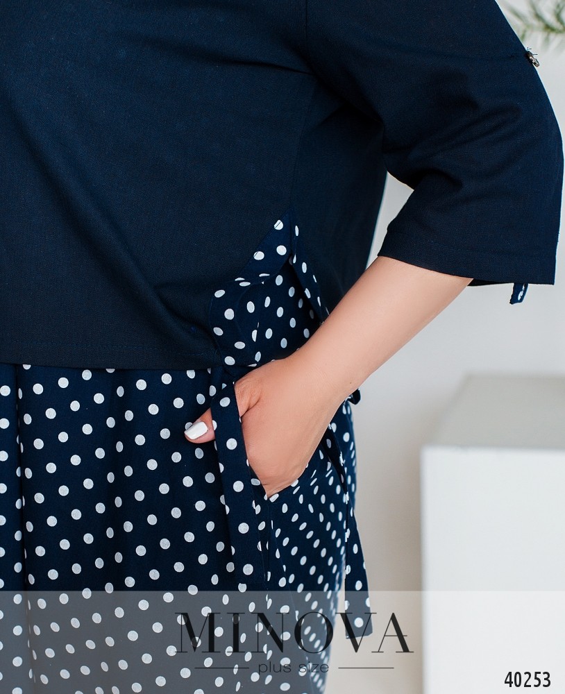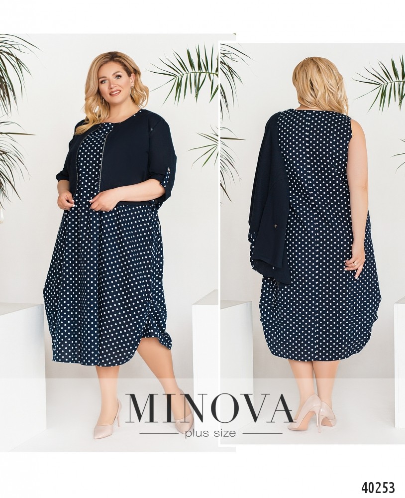 Оригинальный костюм большого размера, в комплекте - платье и накидка с молнией. Платье без рукавов, без застёжек и карманов, по бокам присобрано. Кофточка с регулируемыми рукавами, по бокам - разрез и подшиты ленты, которые можно завязать бантом. Без карманов.