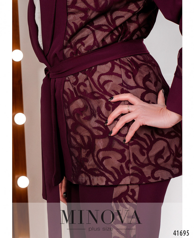 Женственный и романтичный костюм батал с жакетом и брюками. Жакет без застёжек и карманов, тонкая подкладочная ткань прикрывает прозрачный гипюр на полочках и на рукавах. Лацканы гладкие, в комплекте пояс. Брюки со вшитой в пояс резинкой и с карманами, талия высокая. По бокам - гипюровые лампасы с подкладкой.