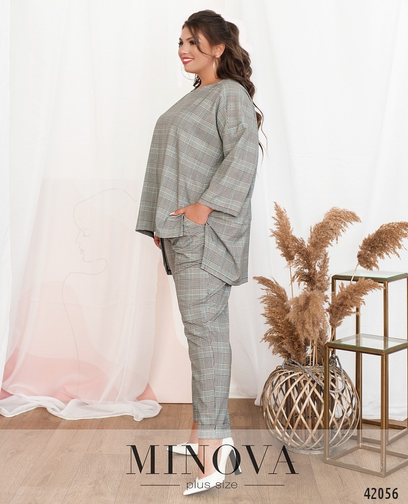 Оригинальный костюм большого размера с брюками и блузой. Блуза свободного кроя, с полукруглым вырезом горловины и асимметричным подолом: по спинке длиннее, по бокам небольшие разрезы. Рукава без манжет. Застёжек и карманов нет. Брюки с высокой талией, в пояс вшита резинка, по бокам - врезные карманы, снизу манжеты.