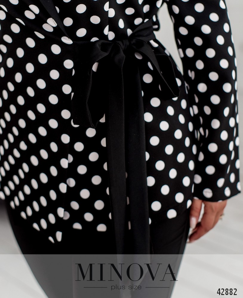 Привлекательный костюм-двойка большого размера. Пиджак без подкладки, завязывается на ленты по внешней стороне и на тесёмки - по внутренней. Спереди продольные вытачки. Лацканы резные. Карманов нет. Брюки с высокой талией, в пояс вшита резинка, по бокам - врезные карманы.