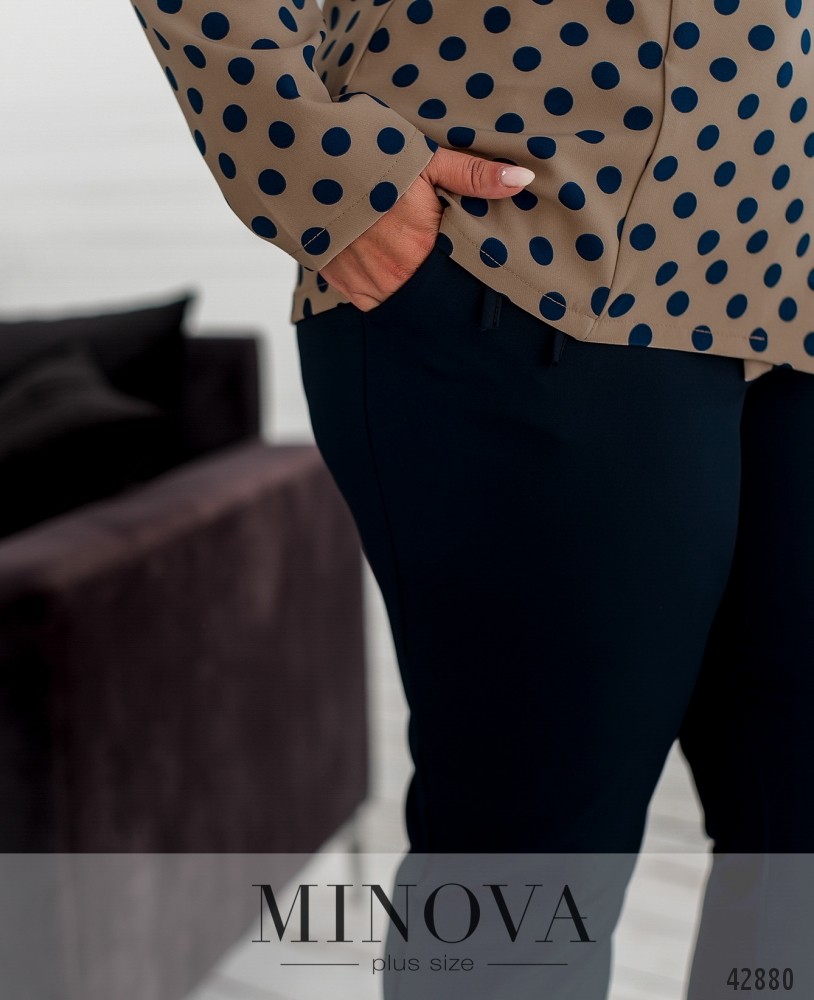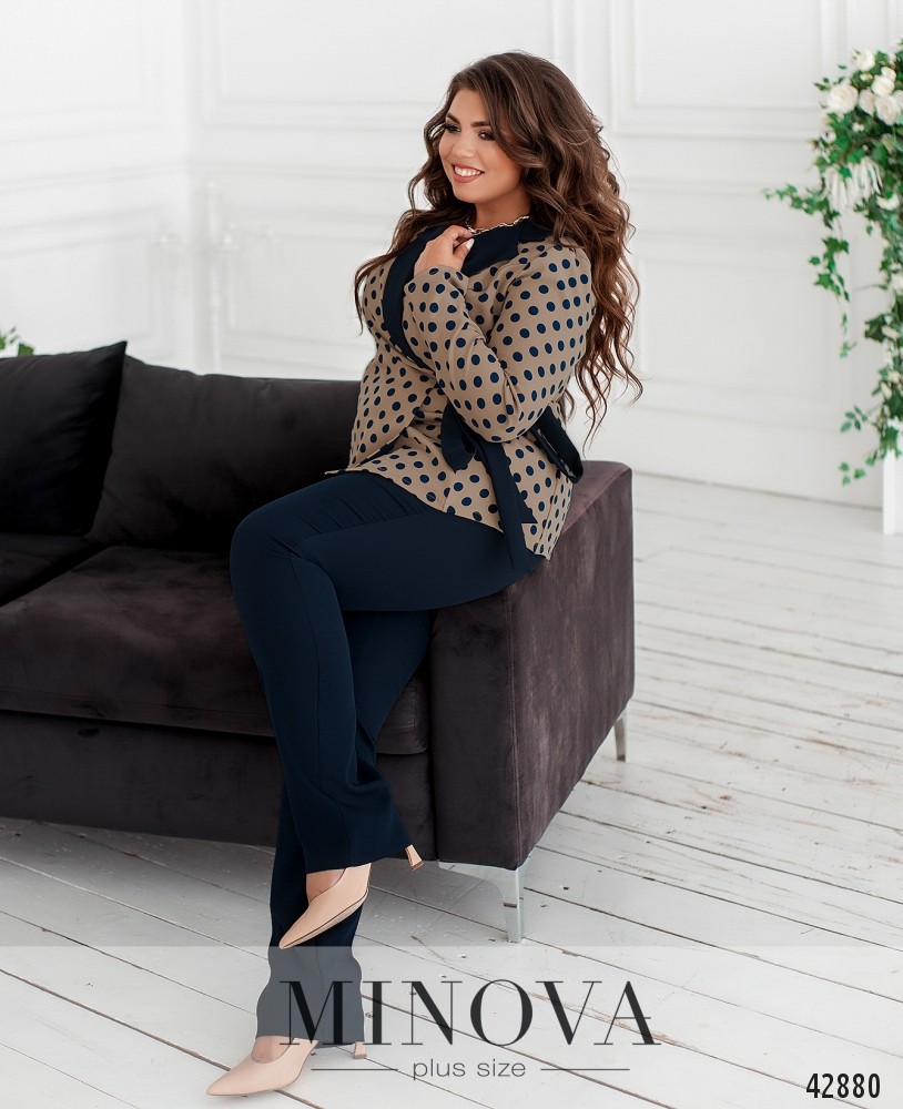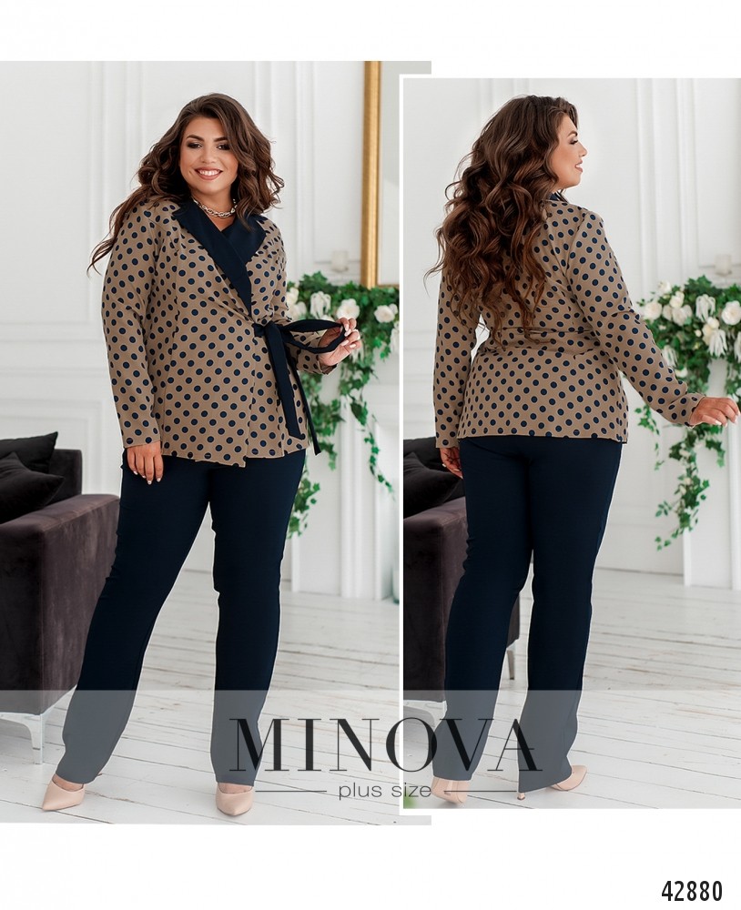 Привлекательный костюм-двойка большого размера. Пиджак без подкладки, завязывается на ленты по внешней стороне и на тесёмки - по внутренней. Спереди продольные вытачки. Лацканы резные. Карманов нет. Брюки с высокой талией, в пояс вшита резинка, по бокам - врезные карманы.