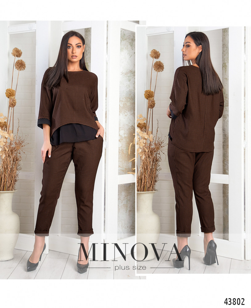 Женственный костюм плюс сайз, блуза без застёжек и карманов, рукава с мягкими манжетами, на подоле снизу полупрозрачная вставка. Брюки с высокой талией, в пояс вшита резинка, снизу небольшие манжеты-отвороты, по бокам карманы.