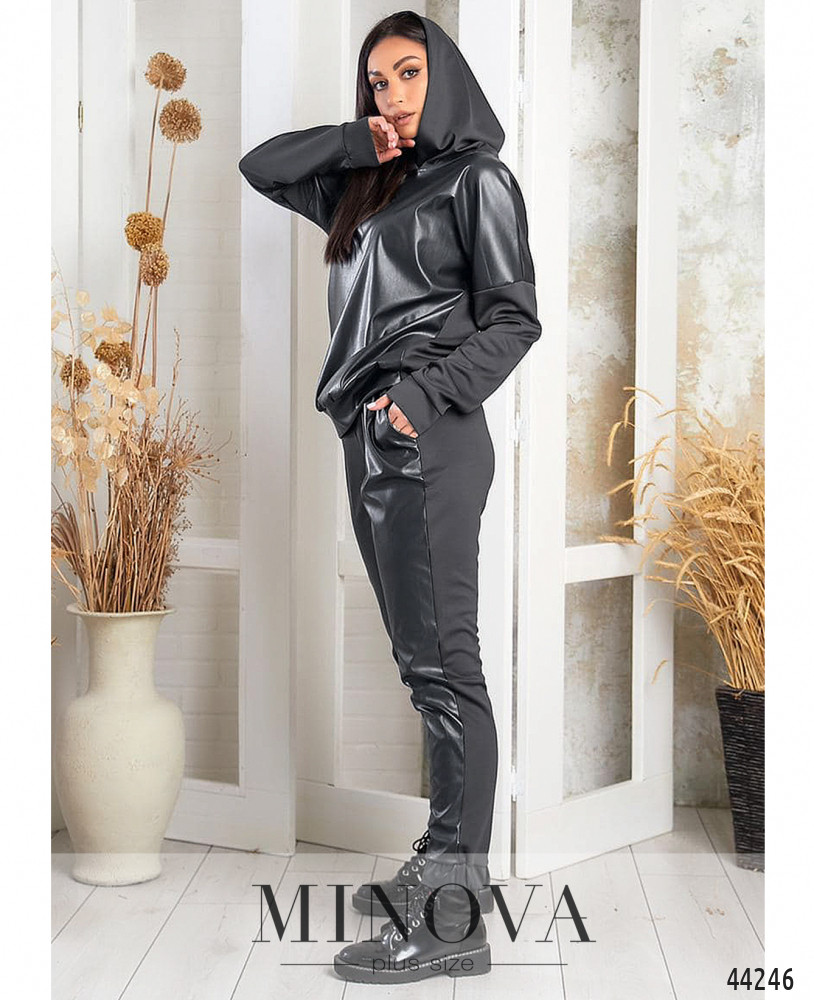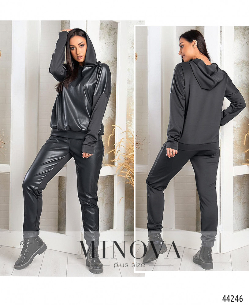 Оригинальный костюм батал из эко-кожи с добавлением ткани дайвинг. Толстовка с капюшоном без шнурков, рукава из мягкой ткани, снизу манжет на подоле. Карманов и застёжек нет. Брюки с высокой талией, по бокам карманы в шве, снизу манжеты, в пояс вшита резинка. Задняя часть брючин из мягкой ткани.