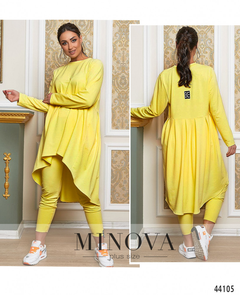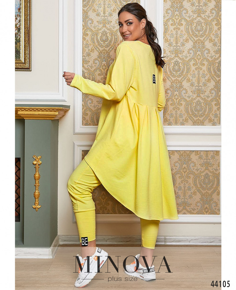 Привлекательный костюм-двойка плюс сайз с длинной расклешённой толстовкой и брюками. Толстовка на спинке украшена декоративной нашивкой и присобрана оборками, ниспадает полукругом. Без карманов и застёжек. Брюки с высокой посадкой и длинными манжетами, на левом манжете декоративная нашивка. По бокам - карманы в шве, в пояс вшита резинка.