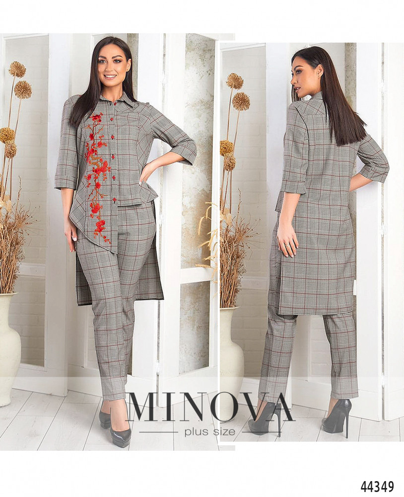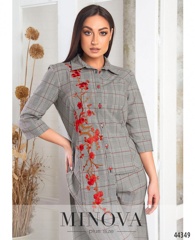 Оригинальный костюм-двойка батал, рубашка с асимметричным подолом: по спинке ровный, длинный. Спереди правая полочка удлинённая, с треугольным низом, левая - короткая, ровная. Правая полочка украшена изысканной вышивкой. Рукава с мягкими манжетами без пуговиц. Застёжка - ряд пуговиц спереди на планке. Воротничок отложной. Брюки с высокой талией, в пояс вшита резинка, по бокам - карманы в шве.