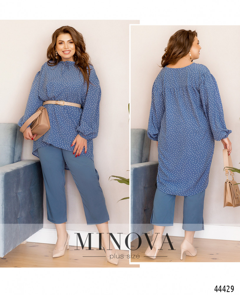 Стильный и оригинальный костюм батал. Блуза свободная, с широким вырезом горловины и двумя лентами-завязками. Рукава со вшитыми в манжеты резинками. Подол асимметричный, по спинке длиннее. По бокам - карманы в шве. Застёжек нет. Брюки с высокой талией, в пояс вшита резинка, по бокам - карманы в шве.