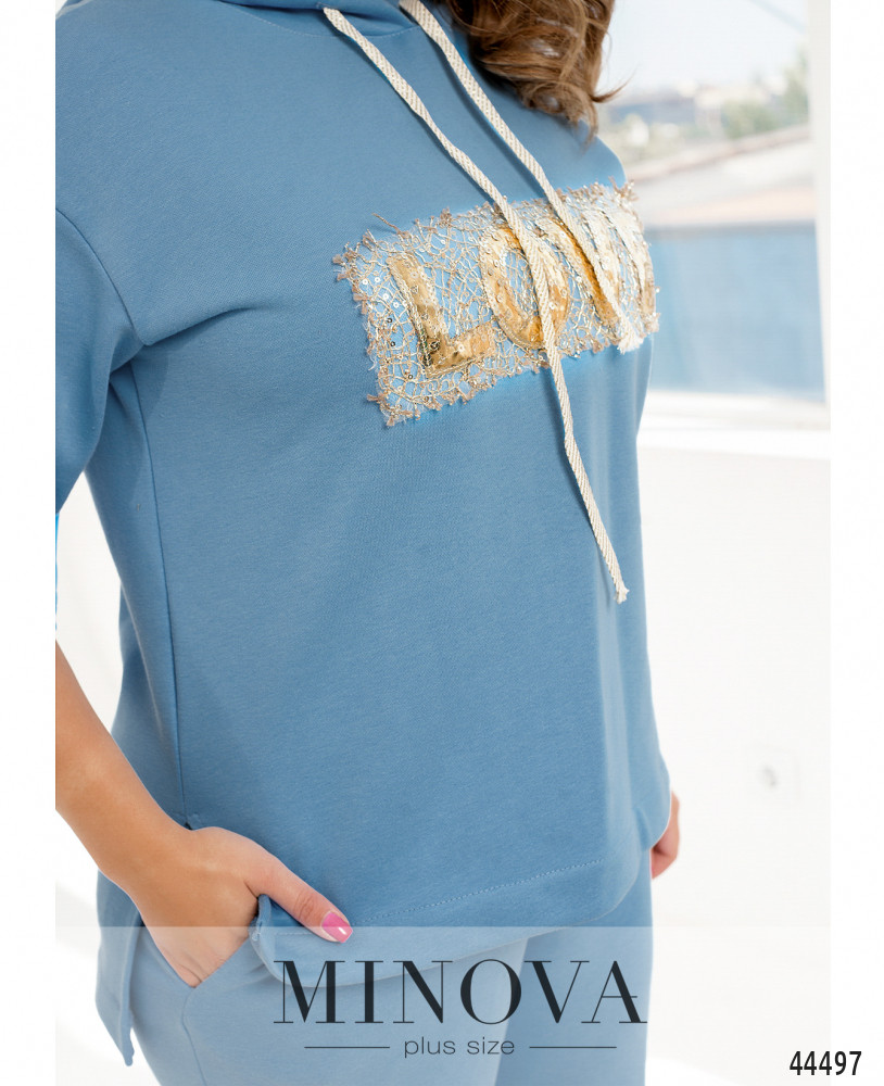 Яркий и удобный костюм большого размера. Толстовка без карманов и застёжек, есть капюшон, через него пропущен шнурок. На груди - декор из пайеток. По бокам подола - разрезы. Рукава без манжет, линия плеча немного приспущена. Брюки с высокой талией, с манжетами, в пояс вшита резинка, по бокам - карманы в шве, застёжек нет.