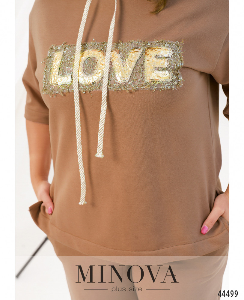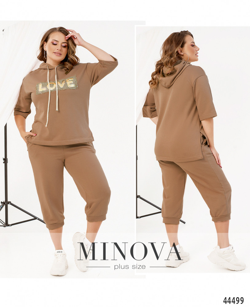 Яркий и удобный костюм большого размера. Толстовка без карманов и застёжек, есть капюшон, через него пропущен шнурок. На груди - декор из пайеток. По бокам подола - разрезы. Рукава без манжет, линия плеча немного приспущена. Брюки с высокой талией, с манжетами, в пояс вшита резинка, по бокам - карманы в шве, застёжек нет.