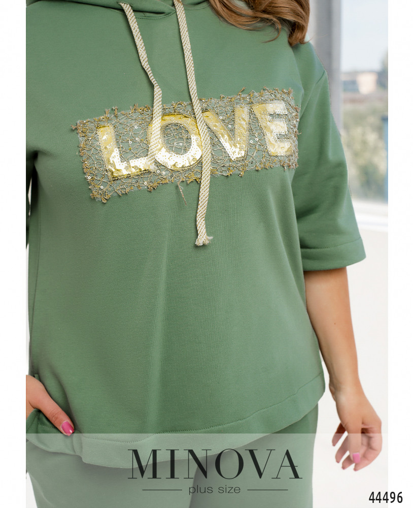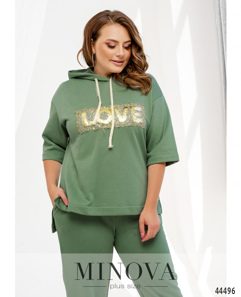 Яркий и удобный костюм большого размера. Толстовка без карманов и застёжек, есть капюшон, через него пропущен шнурок. На груди - декор из пайеток. По бокам подола - разрезы. Рукава без манжет, линия плеча немного приспущена. Брюки с высокой талией, с манжетами, в пояс вшита резинка, по бокам - карманы в шве, застёжек нет.