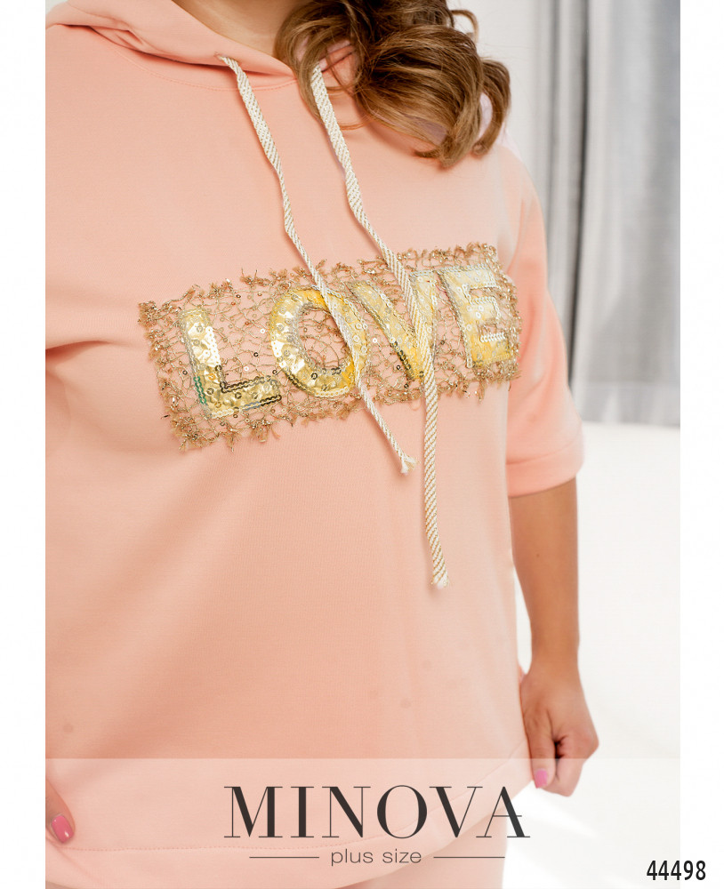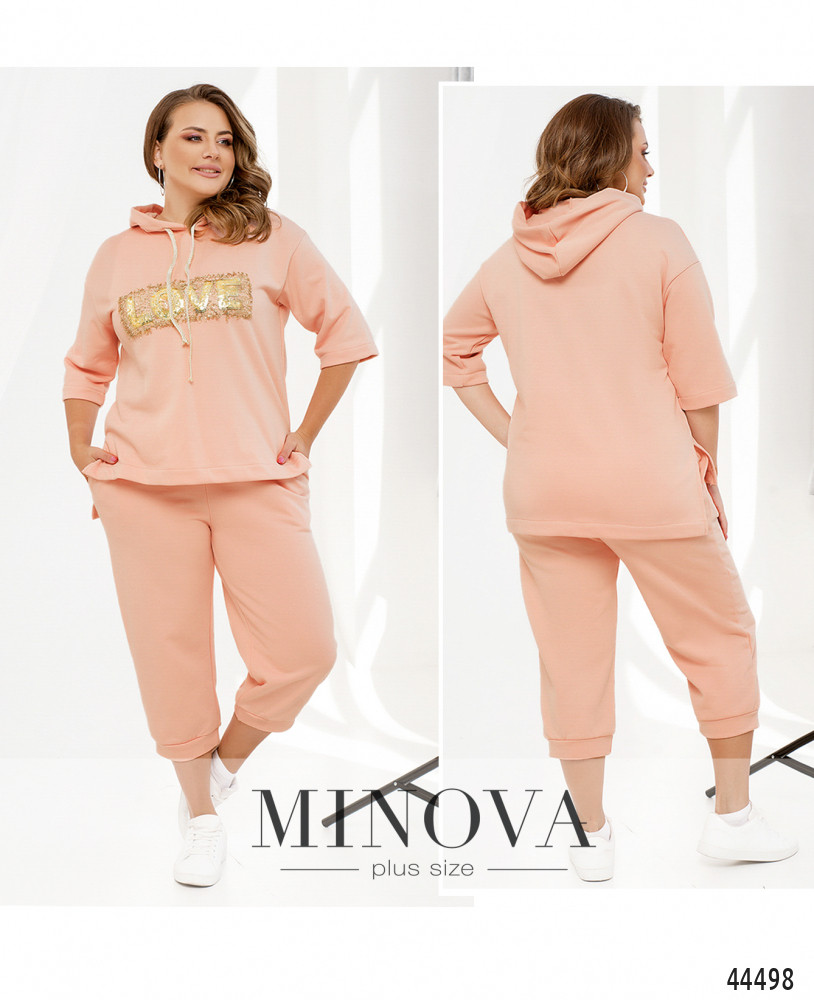 Яркий и удобный костюм большого размера. Толстовка без карманов и застёжек, есть капюшон, через него пропущен шнурок. На груди - декор из пайеток. По бокам подола - разрезы. Рукава без манжет, линия плеча немного приспущена. Брюки с высокой талией, с манжетами, в пояс вшита резинка, по бокам - карманы в шве, застёжек нет.