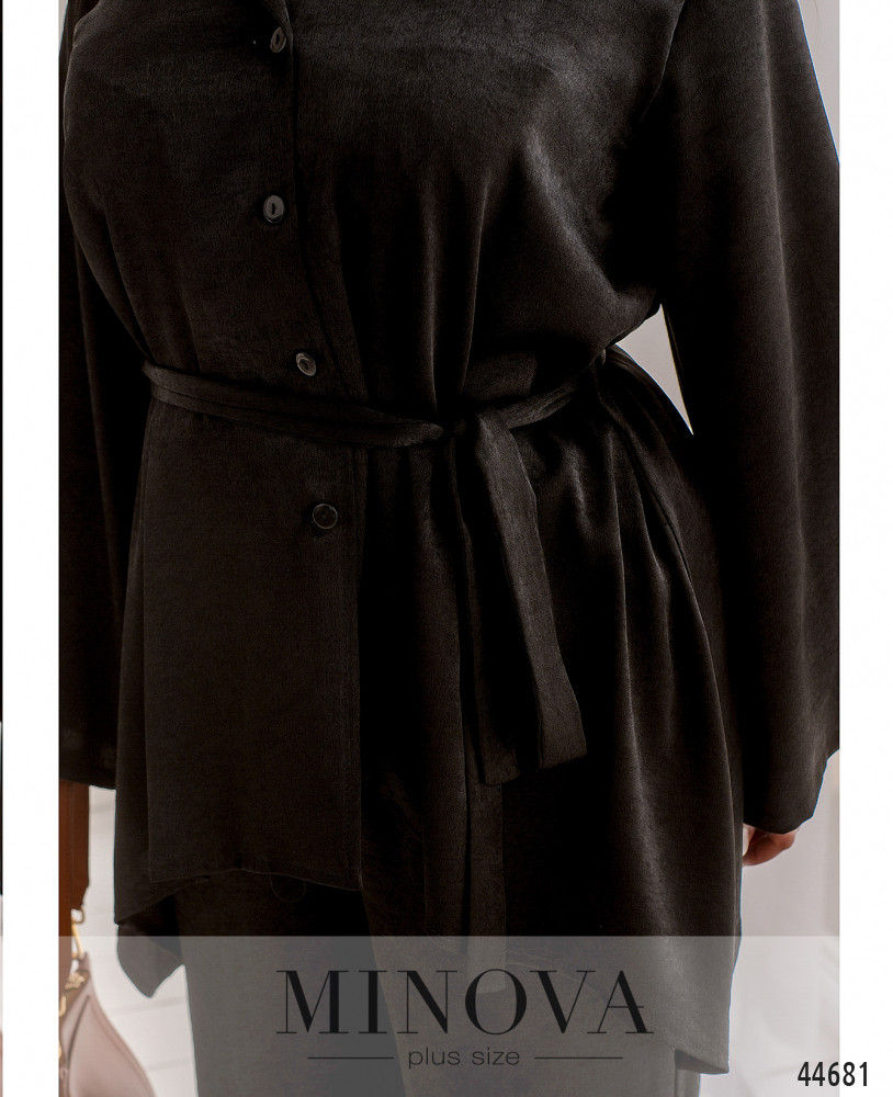 Оригинальный и привлекательный костюм большого размера. Рубашка с шлейками для пояса на талии, воротничок мягкий отложной, рукава без манжет, подол асимметричный, по бокам длиннее. Застёгивается на ряд пуговиц спереди на планке. Брюки с высокой талией, в пояс вшита резинка, по бокам - карманы в шве, застёжек нет. Пояс/аксессуар входит в комплект.