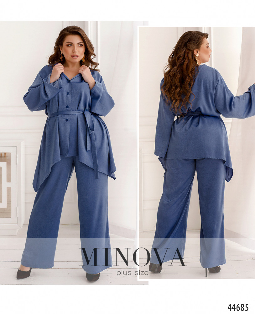 Оригинальный и привлекательный костюм большого размера. Рубашка с шлейками для пояса на талии, воротничок мягкий отложной, рукава без манжет, подол асимметричный, по бокам длиннее. Застёгивается на ряд пуговиц спереди на планке. Брюки с высокой талией, в пояс вшита резинка, по бокам - карманы в шве, застёжек нет. Пояс/аксессуар входит в комплект.