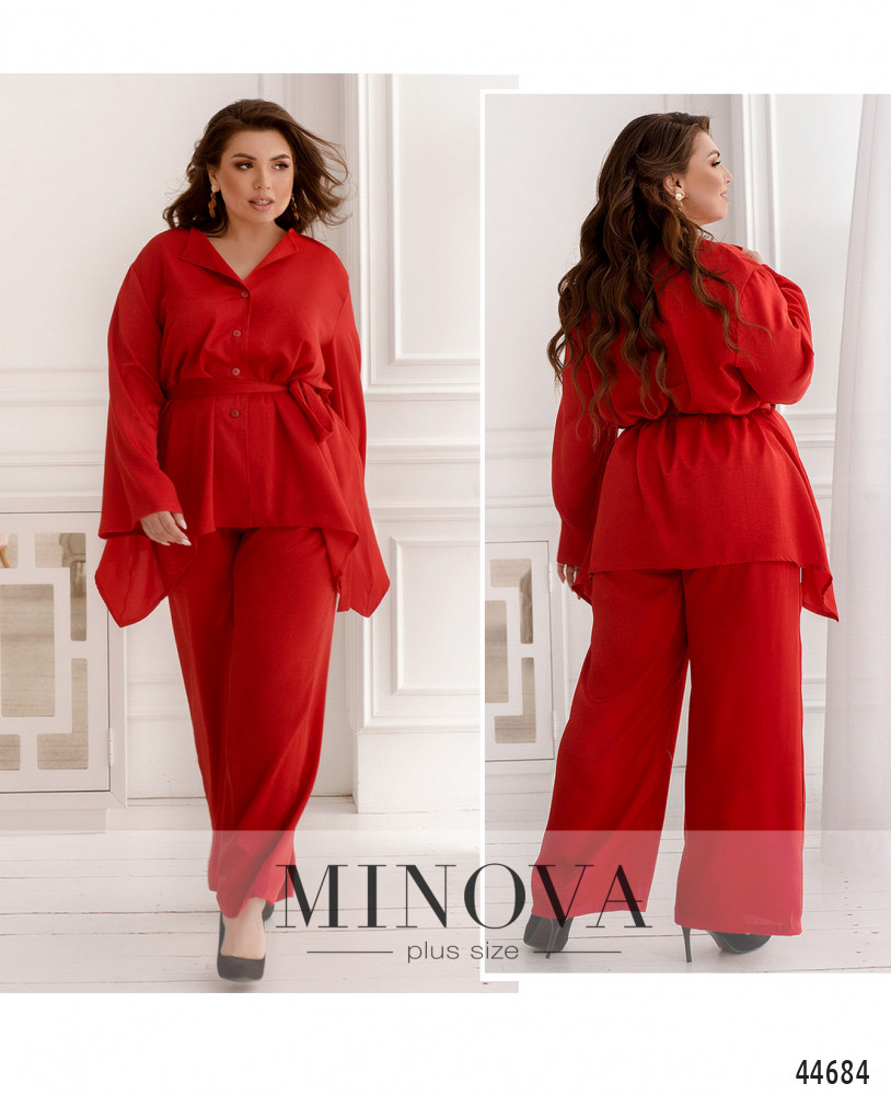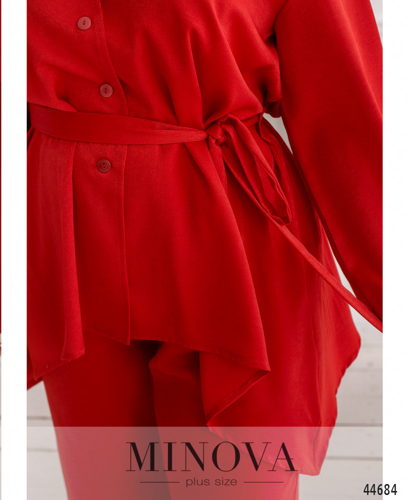 Оригинальный и привлекательный костюм большого размера. Рубашка с шлейками для пояса на талии, воротничок мягкий отложной, рукава без манжет, подол асимметричный, по бокам длиннее. Застёгивается на ряд пуговиц спереди на планке. Брюки с высокой талией, в пояс вшита резинка, по бокам - карманы в шве, застёжек нет. Пояс/аксессуар входит в комплект.