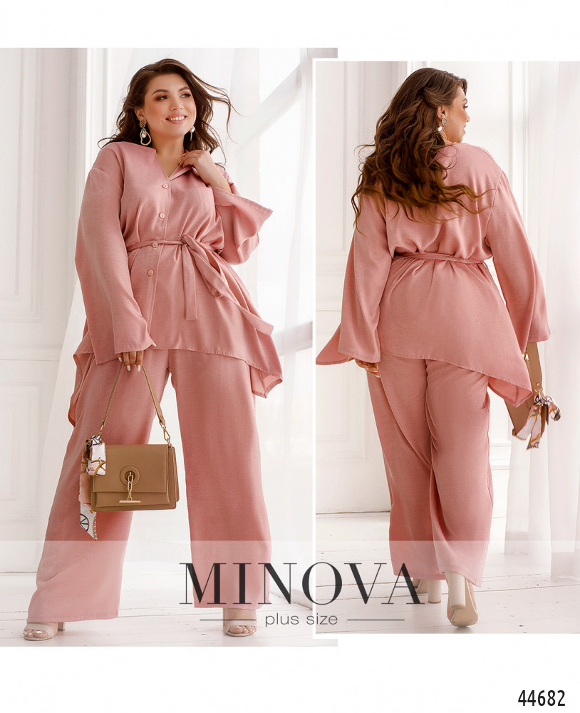 Оригинальный и привлекательный костюм большого размера. Рубашка с шлейками для пояса на талии, воротничок мягкий отложной, рукава без манжет, подол асимметричный, по бокам длиннее. Застёгивается на ряд пуговиц спереди на планке. Брюки с высокой талией, в пояс вшита резинка, по бокам - карманы в шве, застёжек нет. Пояс/аксессуар входит в комплект.