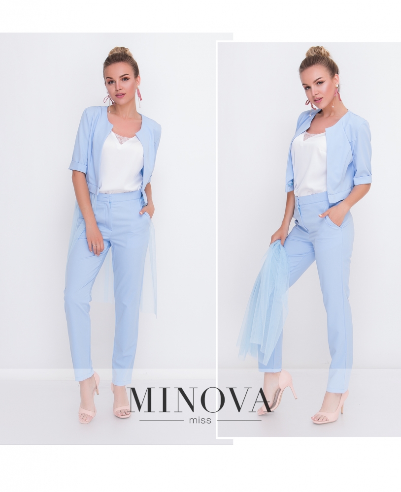 Женственный брючный костюм с отстегивающейся фатиновой баской. Элегантный жакет без застежек с круглым вырезом, короткими рукавами с манжетами и баской на молнии. Зауженные брюки на высокой посадке с карманами застегиваются на молнию и пуговицу. В брюках есть скрытый манжет.
