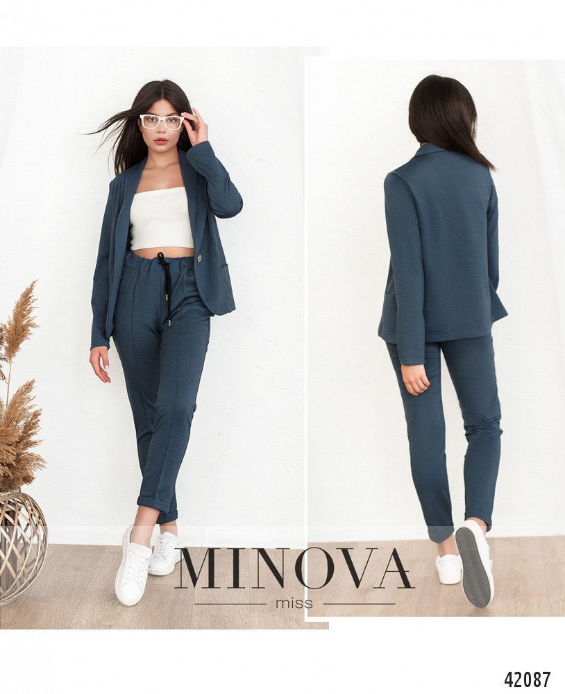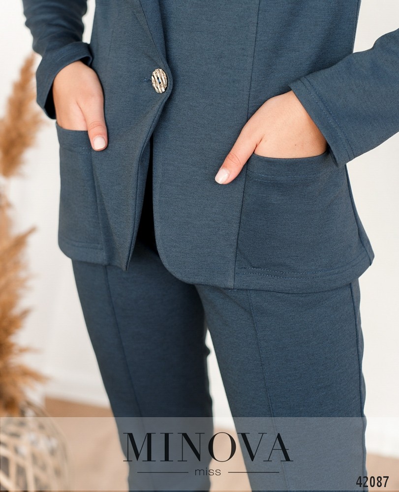Элегантный костюм-двойка с брюками и пиджаком. Пиджак без подкладки, лацканы гладкие. Рукава без пуговиц. Однобортный, застёгивается на одну пуговицу. Брюки с высокой посадкой, в пояс вшита резинка и пропущен шнурок, по бокам - врезные карманы, снизу небольшие манжеты.
