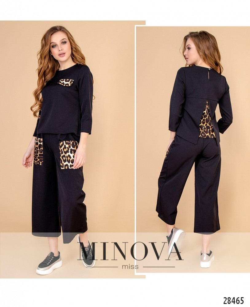 Стильный костюм-двойка с леопардовыми акцентами. Костюм представлен блузой и брюками-кюлотами. Блуза на груди скроена с вытачками у крашена декоративным кармашком. На спине горловина застегивается на пуговицу. От кокетки спускается клиньевая вставка с принтом «леопард». Брюки кюлоты украшены крупными принтованными накладными карманами. Пояс брюк представлен планкой. Брюки застегиваются на боковую скрытую молнию.