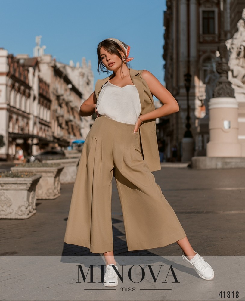 Стильный костюм-двойка с жилеткой и кюлотами. Кюлоты с высокой талией, застёгиваются на молнию, вшитую слева, ткань на талии присобрана оборками. Жилетка без подкладки, однобортная, с одной пуговицей, с врезными карманами.