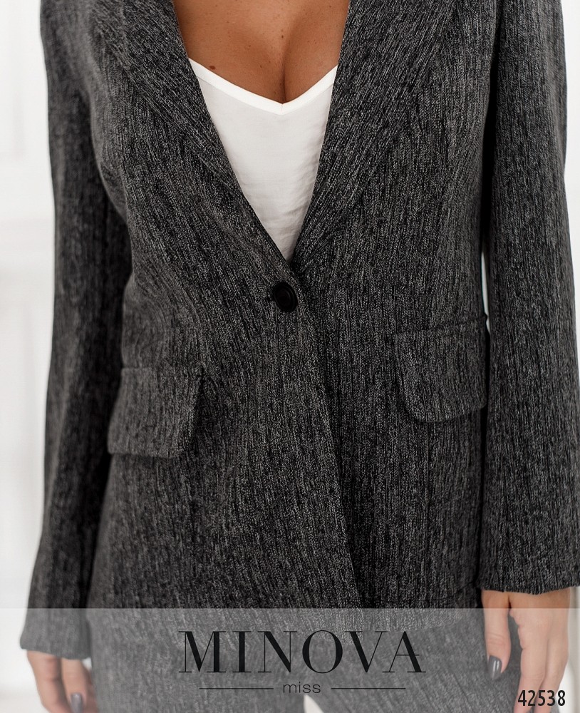 Деловой костюм с пиджаком и брюками. Пиджак без подкладки, приталенный, с подплечниками, застёгивается на одну пуговицу. Карманов нет, есть декоративные клапаны. Брюки с высокой талией, застёгиваются на молнию под ширинкой и пуговицу. По бокам - врезные карманы, на талии шлейки для ремня.