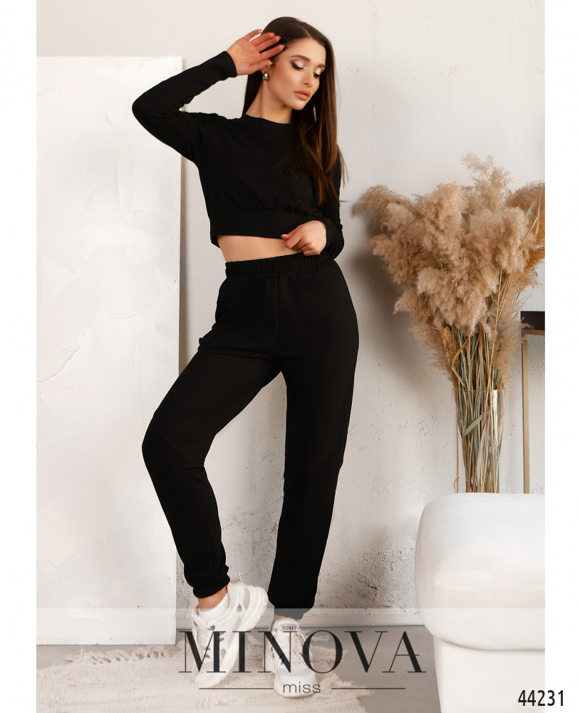 Минималистичный костюм со свитшотом и брюками. Свитшот с мягким манжетом на подоле и на горловине, рукава без манжет, по центру - декоративный шов. Без застёжек и карманов. Брюки со вшитыми в пояс и в манжеты резинками, с декоративным диагональным швом, по бокам - карманы в шве, посадка высокая.