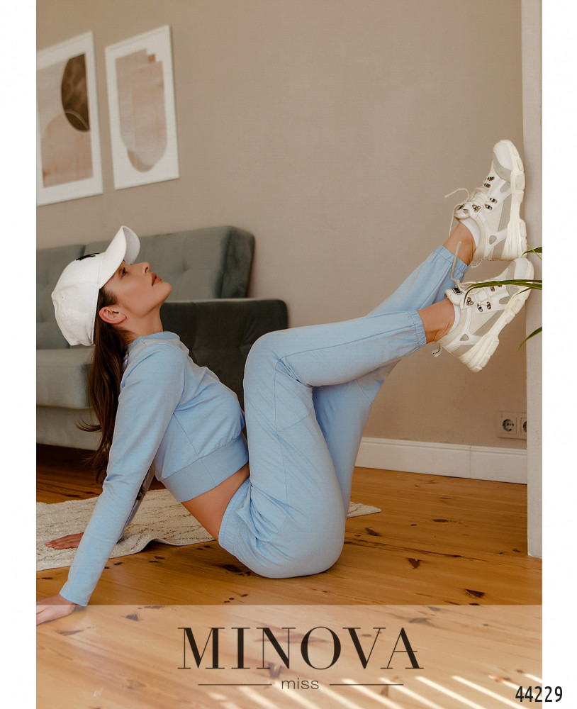 Минималистичный костюм со свитшотом и брюками. Свитшот с мягким манжетом на подоле и на горловине, рукава без манжет, по центру - декоративный шов. Без застёжек и карманов. Брюки со вшитыми в пояс и в манжеты резинками, с декоративным диагональным швом, по бокам - карманы в шве, посадка высокая.