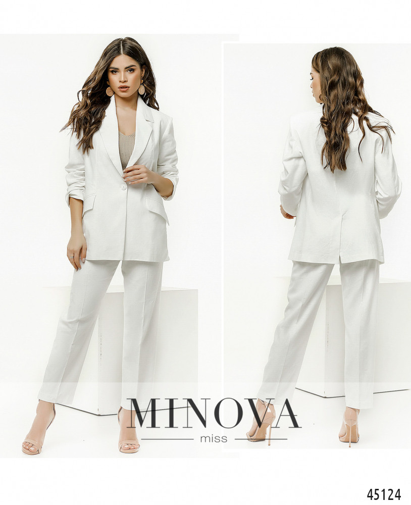 Стильный костюм-двойка с однобортным жакетом и классическими брюками. Лаконичный жакет с подкладкой и рукавами без манжет застегивается на одну пуговицу, по бокам дополнен декоративными клапанами-обманками, а сзади - шлицей. Брюки с высокой талией застегиваются спереди на змейку и пуговицу, а сзади в пояс вшита резинка, обеспечивающая идеальную посадку по фигуре.