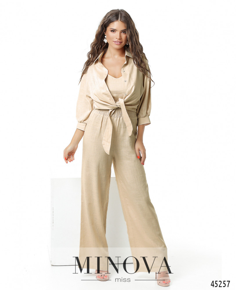 Стильный оригинальный костюм-двойка, выполненный из натуральной ткани, позволяет экспериментировать, создавая разные образы в зависимости от вашего настроения. Жарким летним днем наденьте легкий открытый комбинезон с широкой резинкой, делающей акцент на талии. Верхняя часть комбинезона на тонких бретелях оставляет открытыми плечи, а нижняя выполнена в виде легких свободных брюк прямого кроя. Вечером, когда жара спадет, накиньте сверху короткую рубашку в тон на пуговицах с рукавами длиной 3/4 и с завязками внизу.
