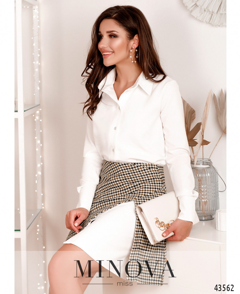 Стильный костюм с длинной блузой и юбкой. Юбка застёгивается на молнию, вшитую по спинке, спереди подшита на запАх с глубоким вырезом. Карманов нет, шлеек для пояса тоже нет. Рубашка с отложным воротничком, спереди - ряд пуговиц на планке, манжеты с двумя пуговицами, карманов нет.