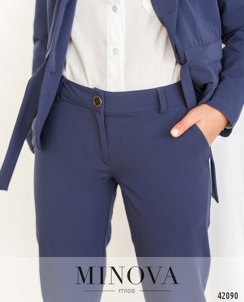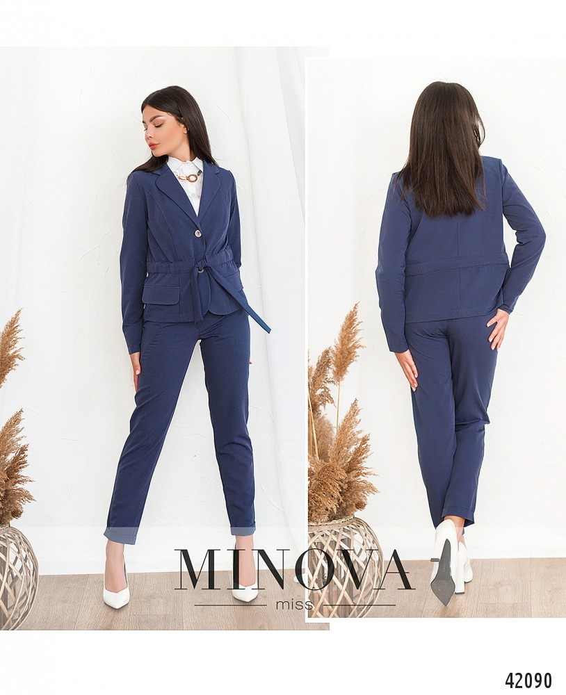 Стильный костюм-двойка в стиле casual. Пиджак без карманов и подкладки, на талии кулиска со шнурком. Однобортный, застёгивается на две пуговицы, под кулиской - декоративные клапаны, лацканы резные. Рукава без пуговиц. Брюки со средней посадкой, снизу манжеты, по бокам - врезные карманы, застёгиваются на молнию под ширинкой и пуговицу. Есть шлейки для пояса.