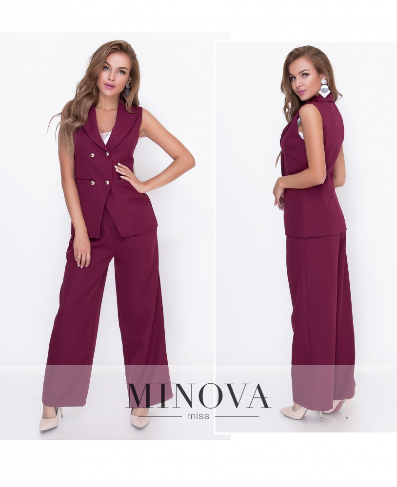 Стильный костюм, состоящий из удлиненного жилета и широких брюк на высокой посадке. Приталенный двубортный жилет с отложным воротником и двумя внешними карманами. Жилет застегивается на две внешние пуговицы. Брюки с поясом застегиваются на две пуговицы и молнию. В брюках присутствуют карманы.