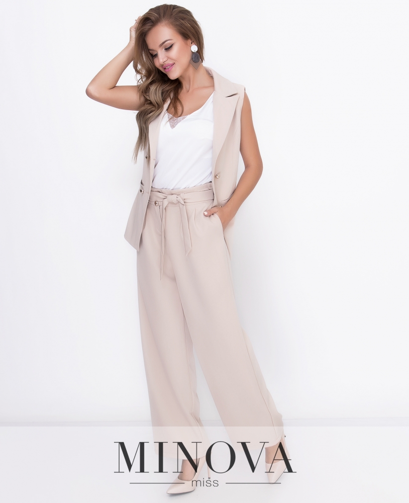 Стильный костюм, состоящий из удлиненного жилета и широких брюк на высокой посадке. Приталенный двубортный жилет с отложным воротником и двумя внешними карманами. Жилет застегивается на две внешние пуговицы. Брюки с поясом застегиваются на две пуговицы и молнию. В брюках присутствуют карманы.