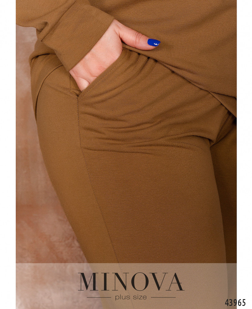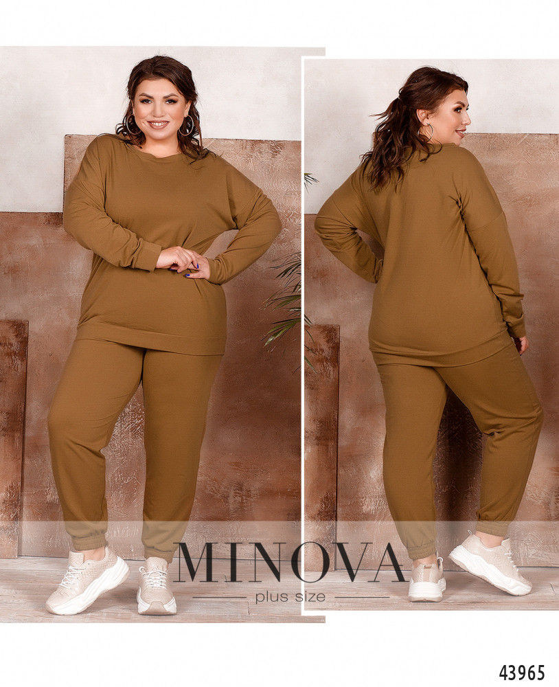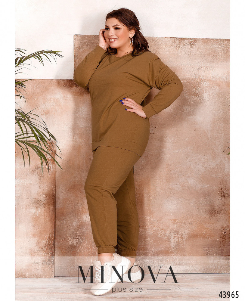 Минималистичный костюм плюс сайз с брюками и свитшотом. Свитшот без застёжек и карманов, вырез горловины полукруглый, рукава, подол и горловина - с мягкими манжетами. Брюки с высокой посадкой, в пояс и в манжеты вшиты резинки, по бокам - карманы в шве.