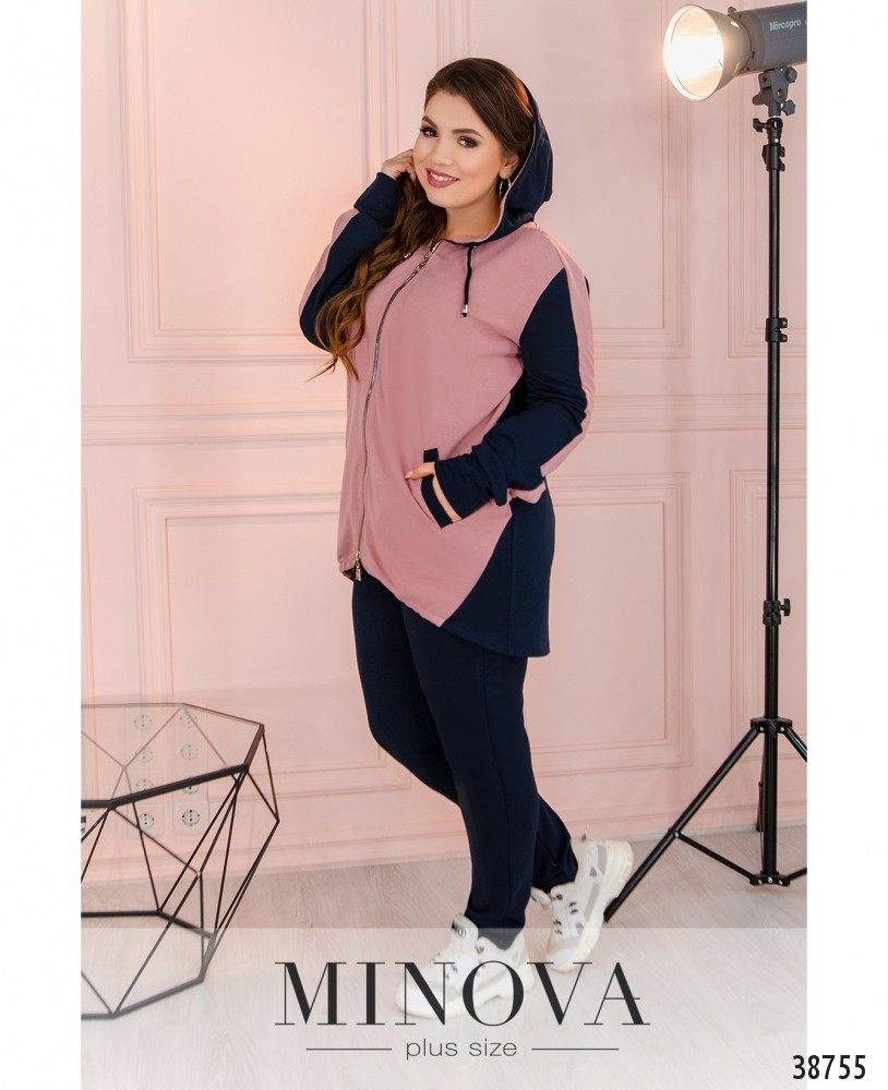 Удобный и яркий повседневный костюм-двойка батал в спортивном стиле. Кофта с молнией по центру, застёгивается на два бегунка, по бокам - карманы, рукава с мягкими манжетами, в наличии капюшон, через него пропущен шнурок. Брюки с высокой посадкой, по бокам - карманы, в пояс вшита резинка, без манжет.