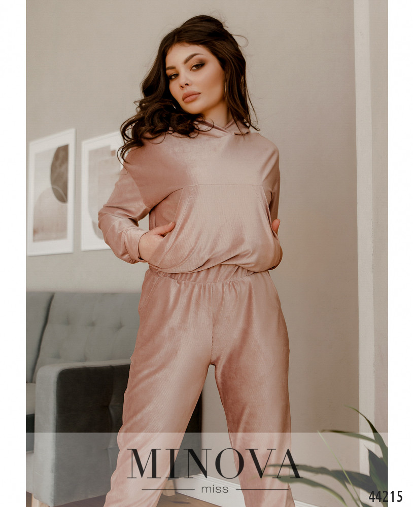 Мягкий и удобный спортивный костюм с толстовкой и брюками. Толстовка с капюшоном без шнурков и с объёмным карманом-кенгуру на талии, рукава и подол с мягкими манжетами. Без застёжек. Брюки с высокой талией, с манжетами, в пояс вшита резинка, по бокам карманы в шве.