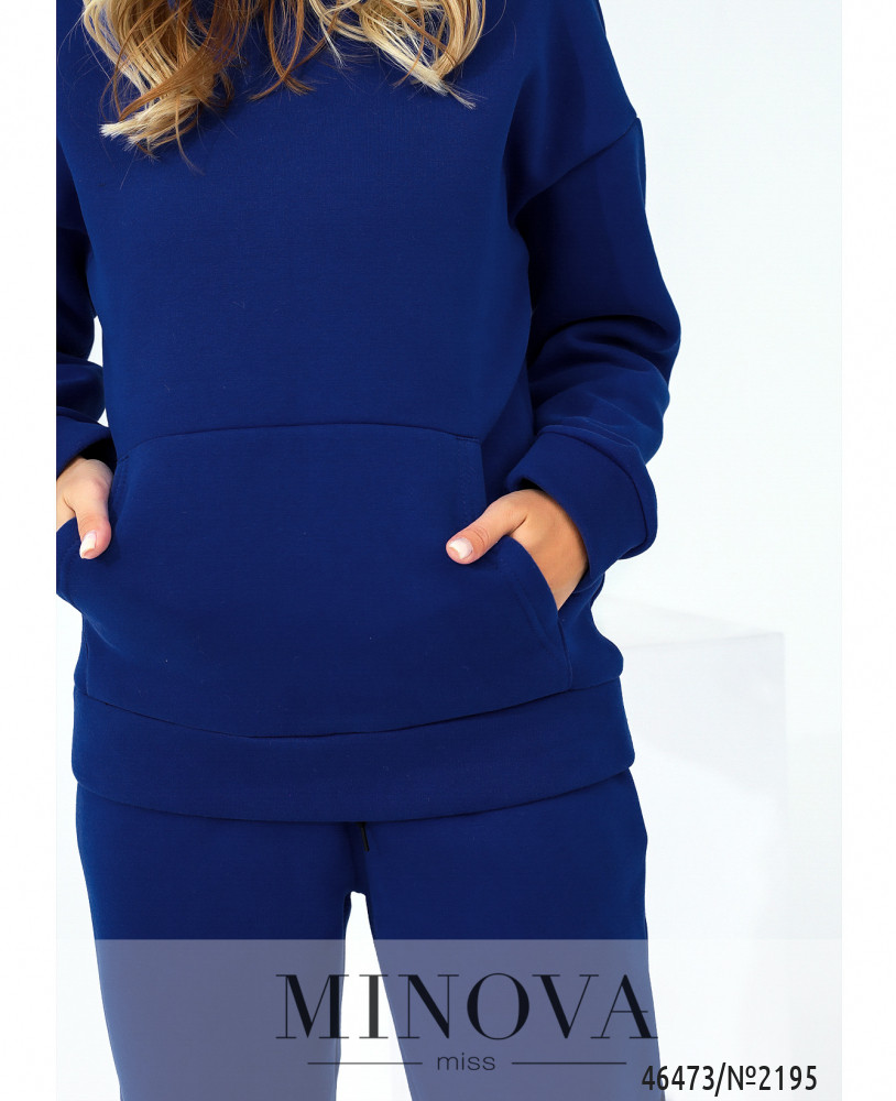 Монохромный яркий спортивный костюм привлекает внимание своей мягкостью и удобством. В комплект входят актуальные брюки-джоггеры с карманами и резинками, вставленными по линии талии и по низу штанин, а также лаконичное худи с капюшоном, большим карманом спереди и рукавами с приспущенной линией плеч.