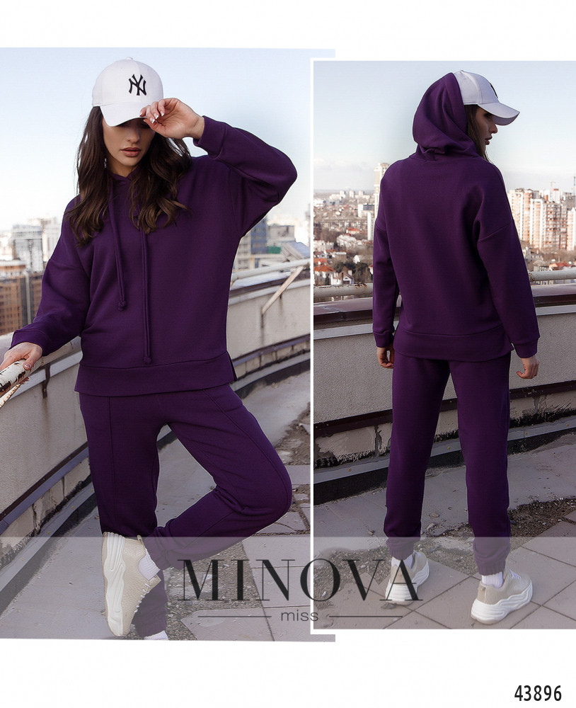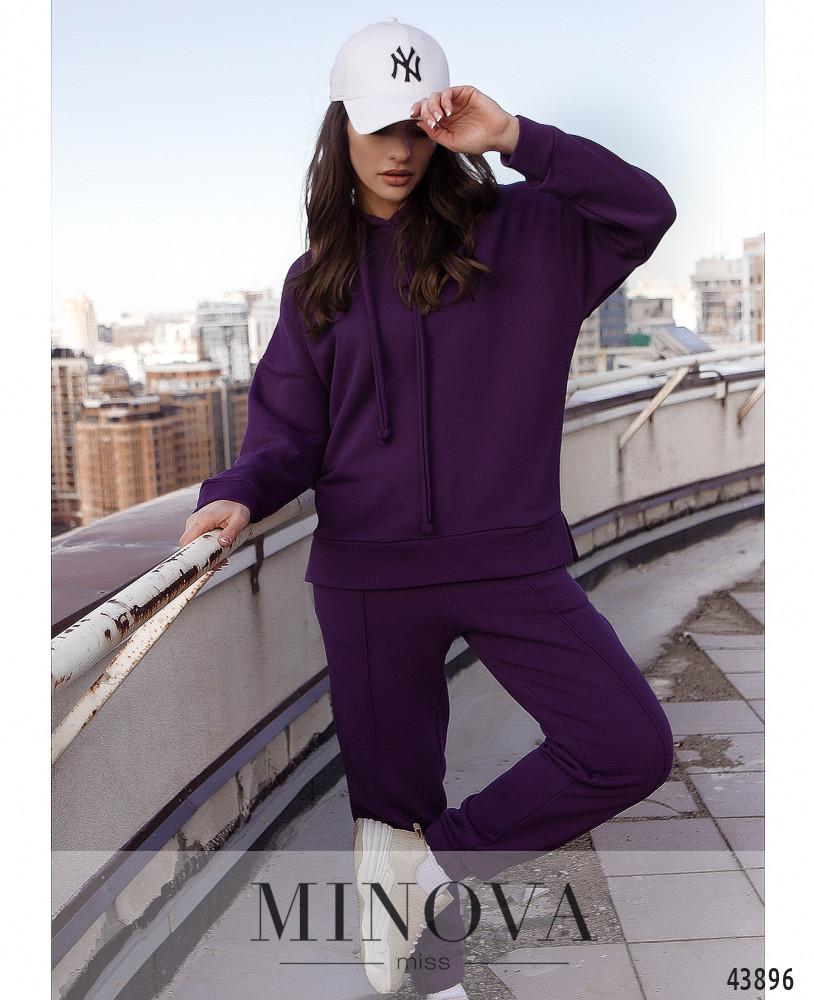 Элегантный и яркий костюм с толстовкой и брюками. Брюки с высокой талией, в пояс и в манжеты вшита резинка. По бокам - карманы в шве, спереди нашиты швы-стрелочки. Застёжек нет. Толстовка с капюшоном и шнурками, отверстия для шнурков без люверсов. Карманов нет, линия плеча приспущена. По бокам подола небольшие разрезы. Без застежек.
