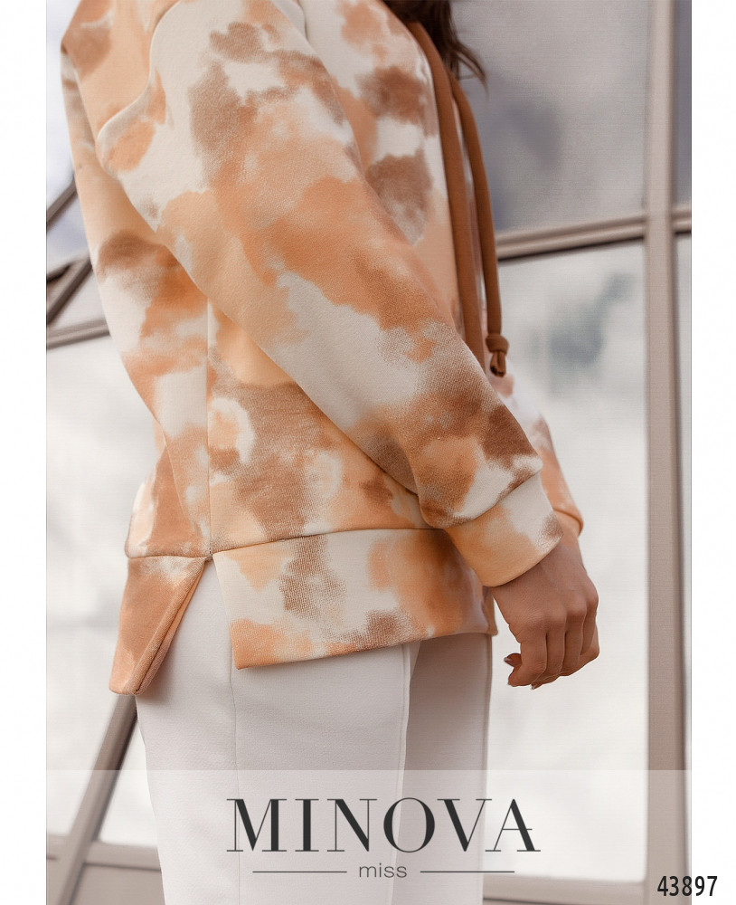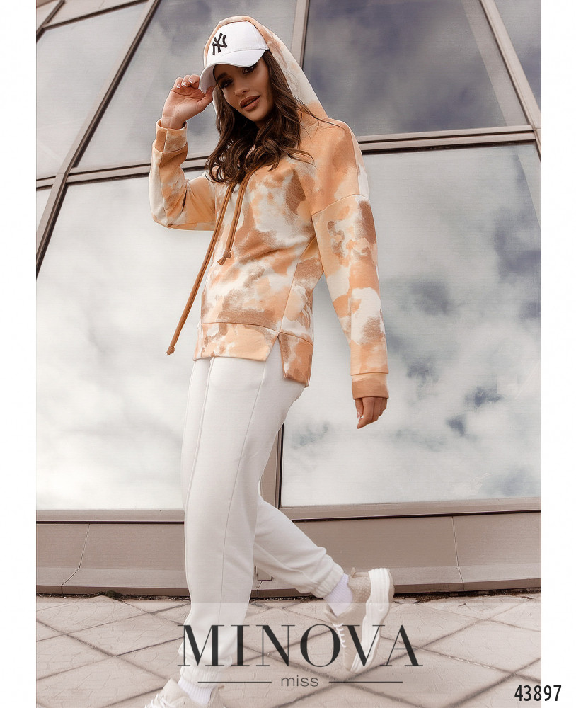 Элегантный и яркий костюм с толстовкой и брюками. Брюки с высокой талией, в пояс и в манжеты вшита резинка. По бокам - карманы в шве, спереди нашиты швы-стрелочки. Застёжек нет. Толстовка с капюшоном и шнурками, отверстия для шнурков без люверсов. Карманов нет, линия плеча приспущена. По бокам подола небольшие разрезы. Без застежек.