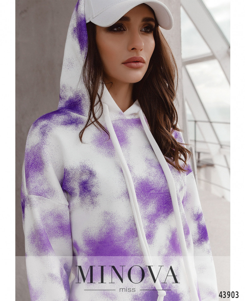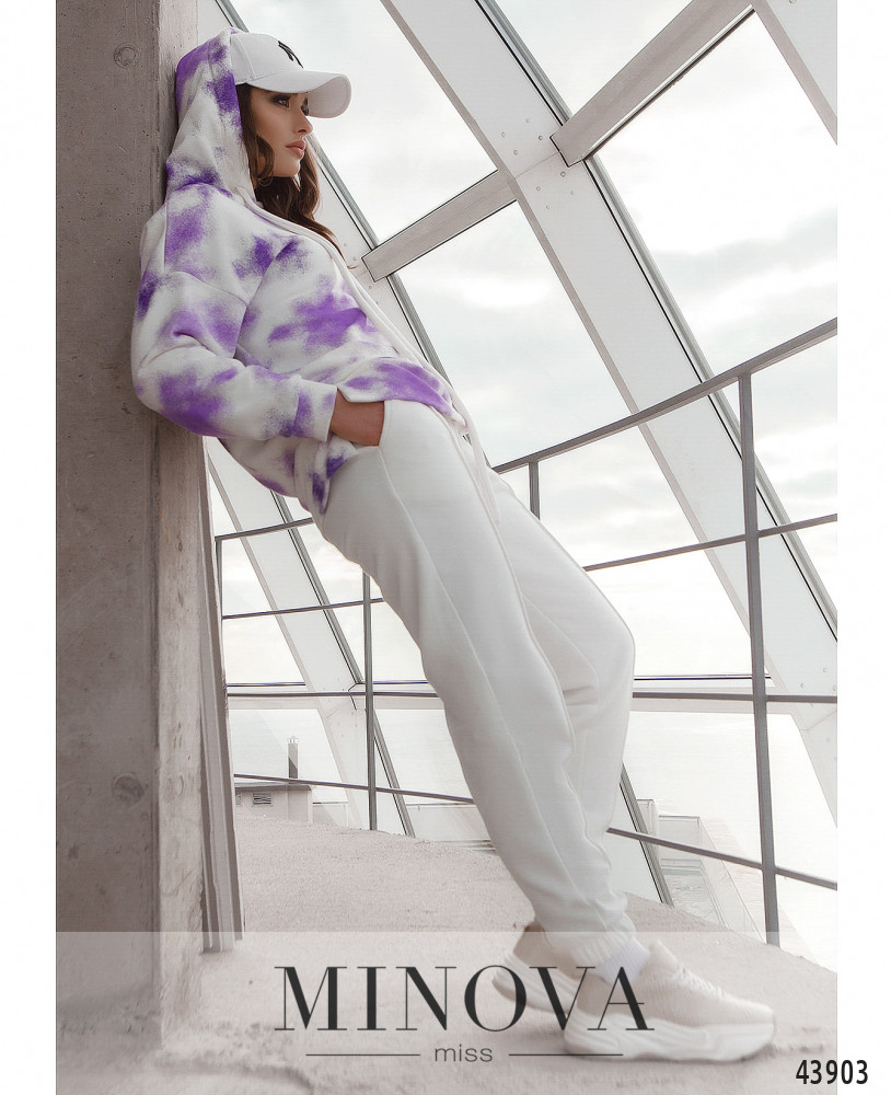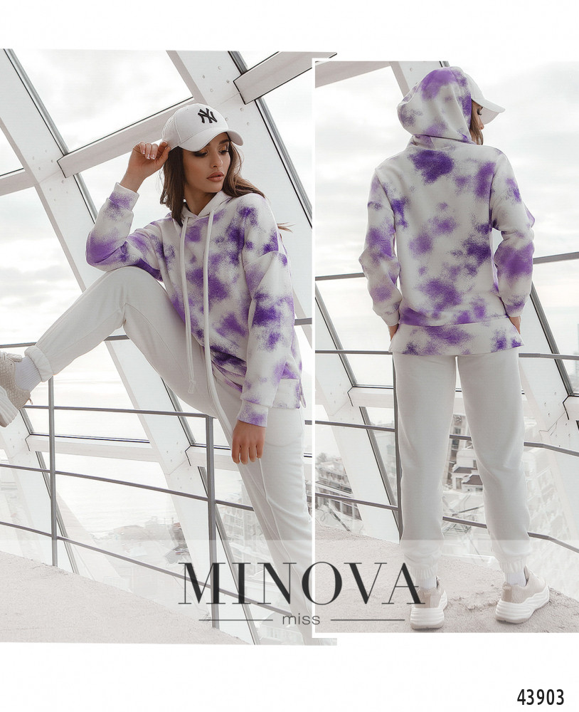 Элегантный и яркий костюм с толстовкой и брюками. Брюки с высокой талией, в пояс и в манжеты вшита резинка. По бокам - карманы в шве, спереди нашиты швы-стрелочки. Застёжек нет. Толстовка с капюшоном и шнурками, отверстия для шнурков без люверсов. Карманов нет, линия плеча приспущена. По бокам подола небольшие разрезы. Без застежек.