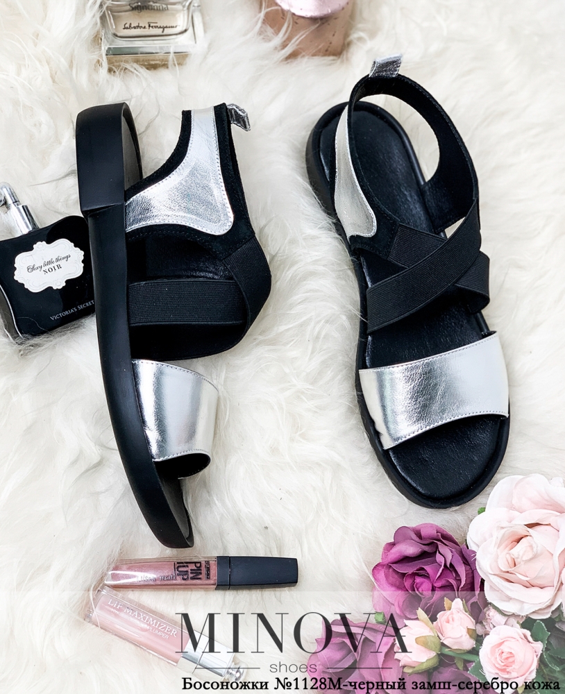 Кожаные сандалии на плоской бортовой подошве с небольшим каблуком. Нос и замшевый задник оформлены металлизированной кожей. Мыс выполнен из эластичных лент, расположенных накрест. Задник дополнен петлей.