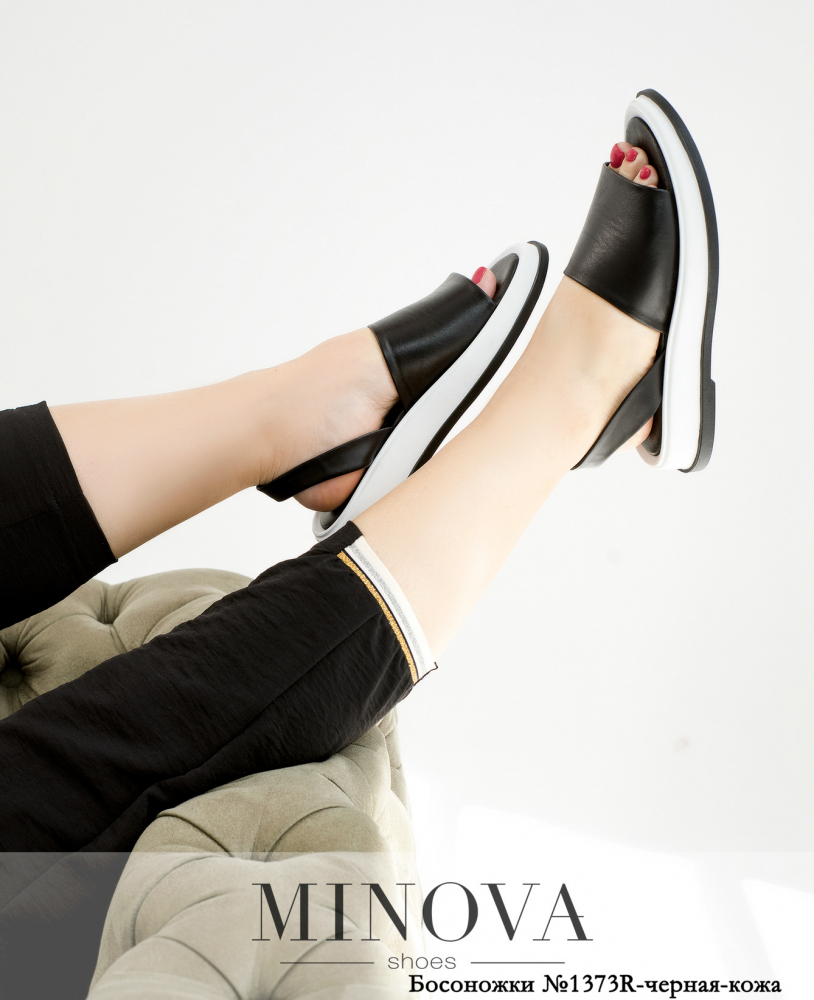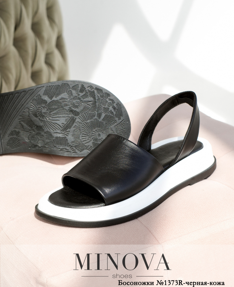 Минималистичные босоножки из натуральной мягкой кожи с объемной черно-белой подошвой без застежек. На ноге держатся за счет шлейки вокруг пятки и маленькой резиночки, вшитой в нее с внутренней стороны по центру
