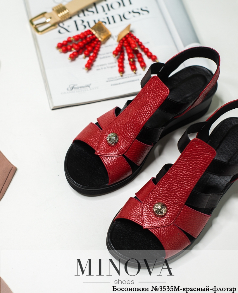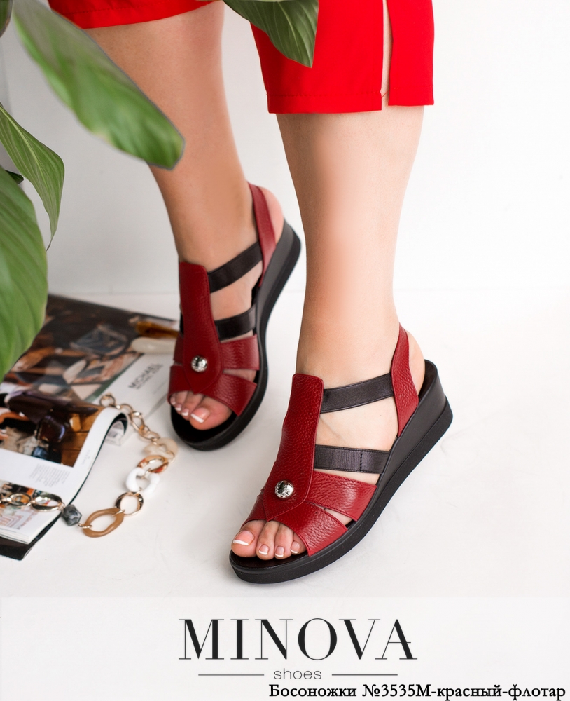 Нарядные и удобные босоножки на невысокой устойчивой танкетке, кожаные, без застёжек, с эластичными вставками на подъёме. Украшены металлическим декором на подъёме. Носок и пятка открытые.