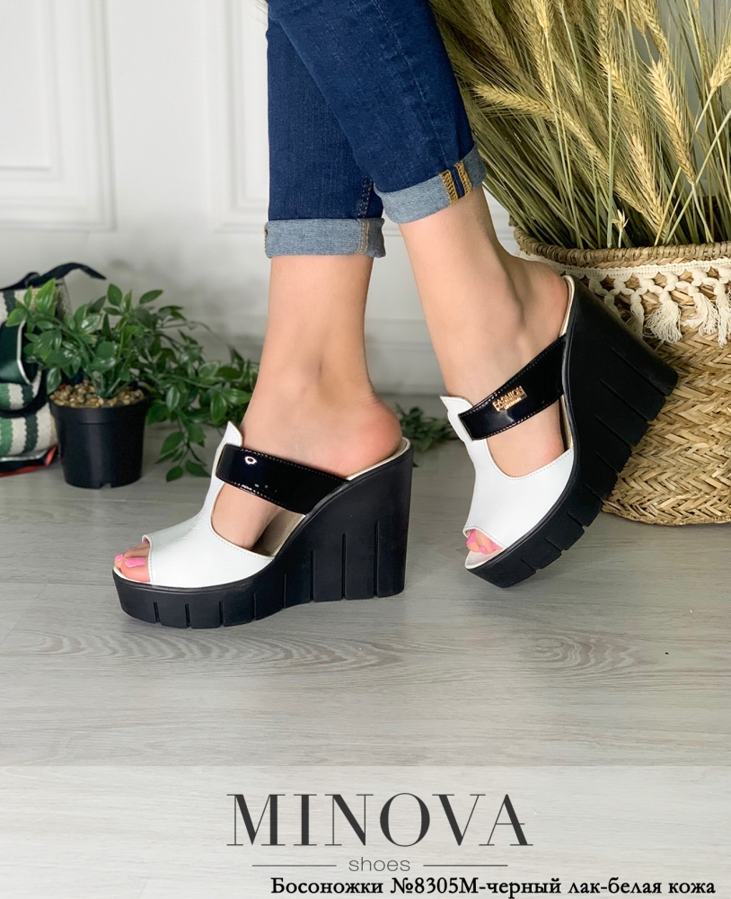 Кожаные мюли на высокой фактурной танкетке. Верхняя часть состоит из фигурно вырезанного кожаного полотна и лакового ремешка со значком. Внутри кожаная стелька.