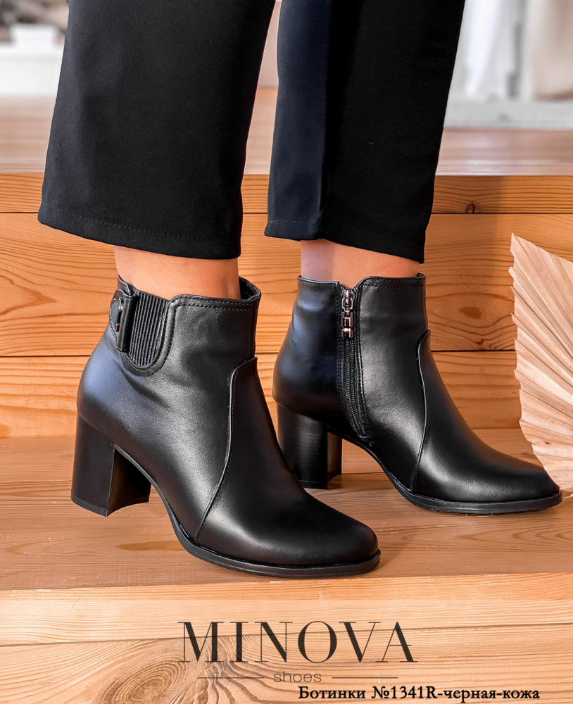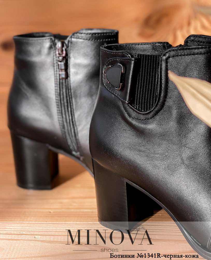 Элегантные кожаные ботинки на устойчивом каблуке, носок отрезной, на внешней стороне - вставка плотной резинки и металлический декор. На внутренней стороне - рабочая молния. Подошва с поперечным рифлением.