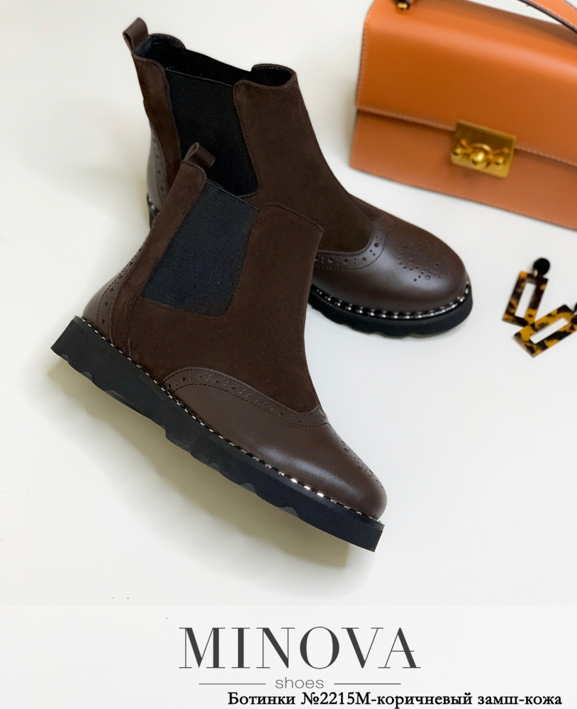Широкая плотная резинка – практичная замена «молнии» и шнуровке. Представленная в новом каталоге Minova модель ботинок челси оснащена резинками с двух сторон, поэтому их удобно надевать и они хорошо сидят на ноге. На заднике – небольшой язычок для большего удобства. Рант подошвы окантован металлическими заклёпками, оттеняющими её тёмный цвет. Ботинки из натуральной кожи в разных сочетаниях замша и гладкой кожи: носок в основном гладкий, расширенный до середины стопы. Вы найдёте в каталоге модели тёмных, благородных оттенков, а также яркую красную модель, что позволит подчеркнуть вашу индивидуальность. Резинка чёрная во всех вариациях. Хороший вариант для демисезонного ношения с джинсами или брюками.