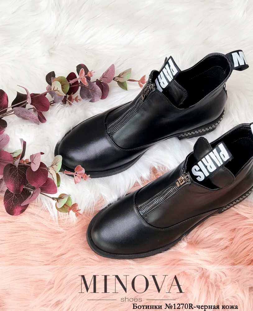 Кожаные ботинки с расположенной спереди молнией и удлинённым язычком, декорированным лентой с принтом. Носок отрезной, каблук невысокий, украшен металлическими заклёпками. Носок и задник выше средней части, выгнуты полукругом. Протектор мелкорифлёный.