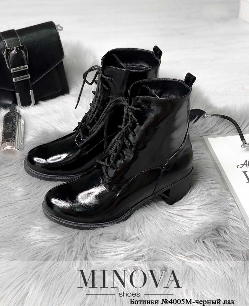 Строгие, минималистичные, но очень стильные ботинки из прекрасной натуральной кожи – гладкой, замшевой или лакированной, представлены в каталоге Minova в нескольких цветовых решениях. Так вы сможете выбрать модель, идеальную для вашего гардероба. Обувь однотонная, без инородных вставок. На подъёме располагается рабочая шнуровка с тонкими шнурками, без металлических колечек (люверсов) на отверстиях. Под шнуровкой – плотный язычок для большей герметичности. Внутри ботинки утеплены цигейкой. Каблук средней высоты, квадратный, удобный для долгих пеших прогулок, протектор мелкоребристый. Сзади сверху подшита петелька. Такие ботинки удачно будут сочетаться и с юбкой, и с брюками.