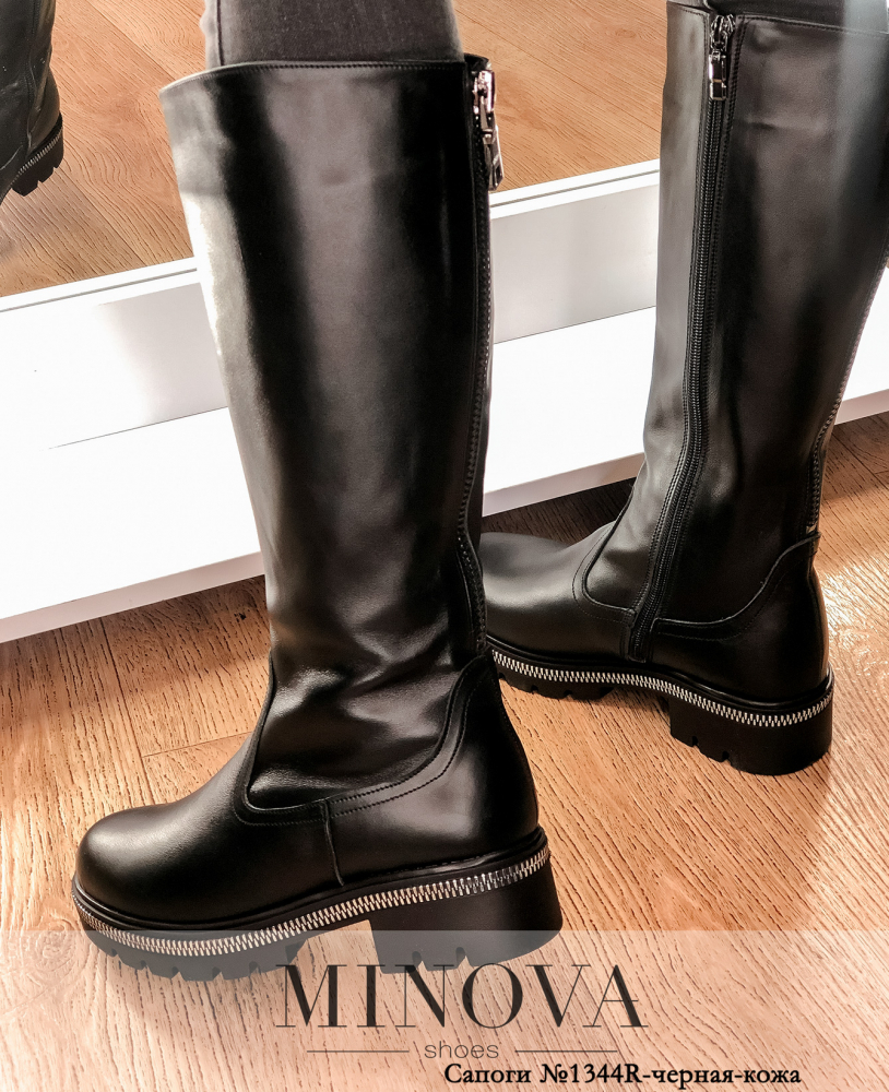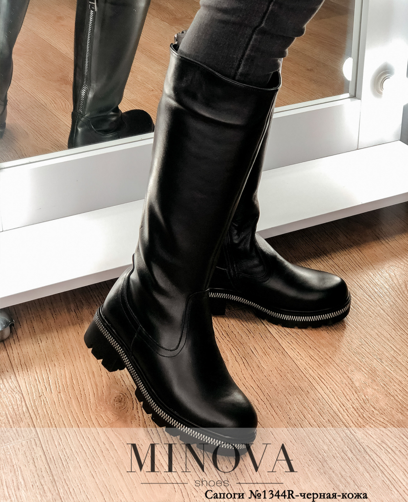 Стильные сапоги из натуральной кожи с высоким голенищем, по внутренней стороне - рабочая молния, на заднем ремне также расположена молния для расширения голенища. Каблук невысокий, подошва рельефная, с контрастной окантовкой.