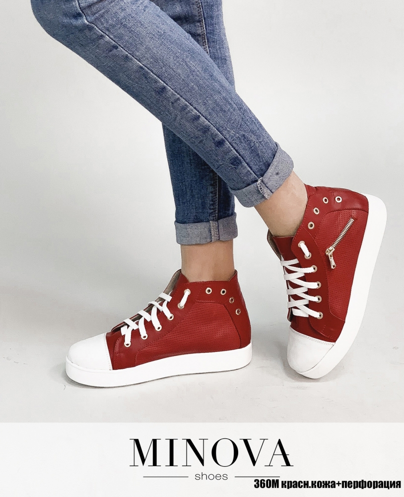 Кожаные кеды на шнурках с высоким голенищем. Кеды украшены с декоративными заклепками и молниями. Носочек и подошва изготовлены из контрастного материала.